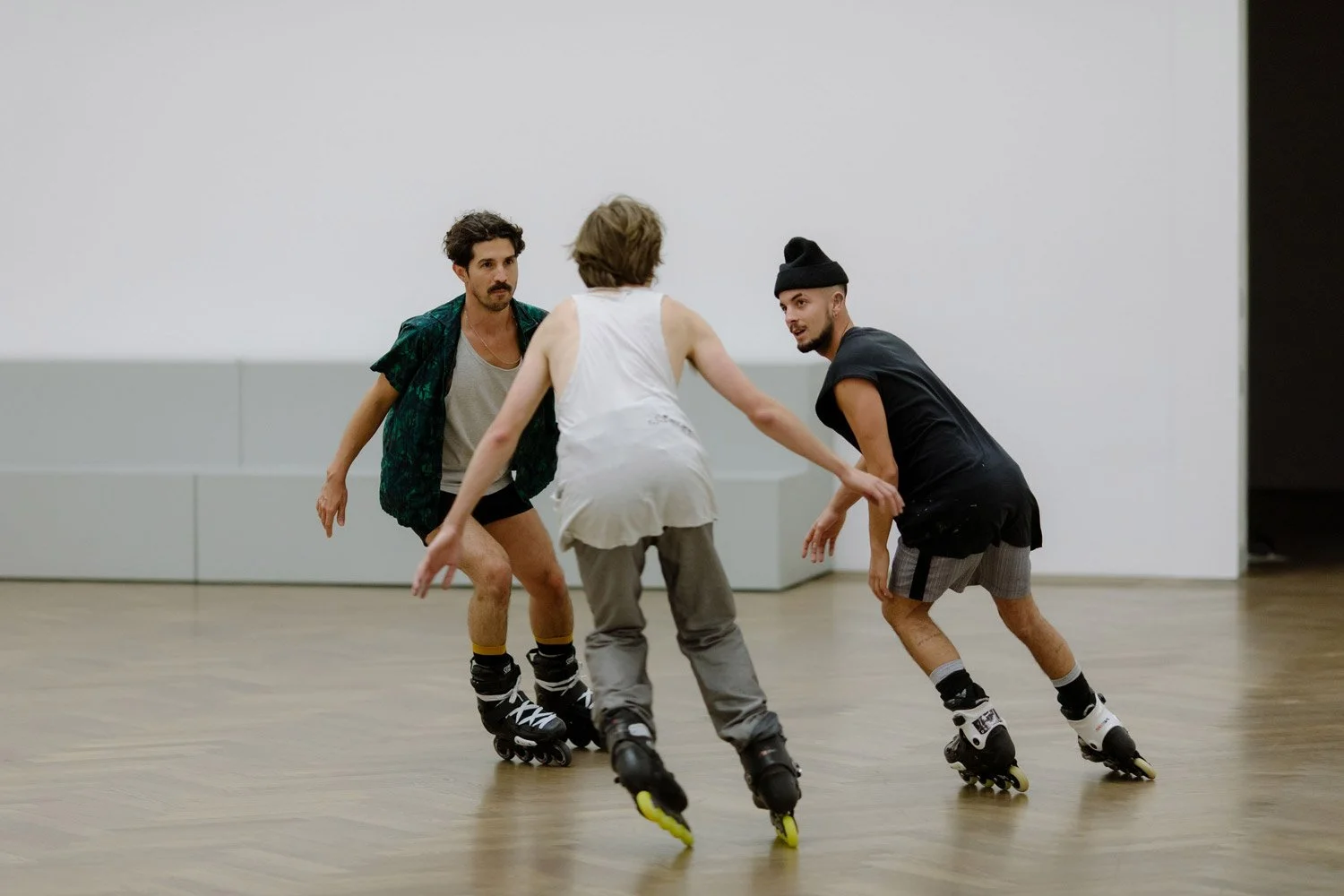 In Alex Baczynski-Jenkins’s Us Swerve (2014), performers on rollerblades orbit one another while reciting, remixing, and reformulating fragments of poetry that meditate on the subject of desire. This polyphonic choreographic “score” is perpetually altered by the performers’ movements, attitudes, and affects. As the performers circulate, they begin to channel a queer archive of verses and inflections, including lines from writers such as Essex Hemphill, Eileen Myles, and Langston Hughes. These articulations of desire and the sensuality of repetition both set the rollerbladers in motion and create a tableau for them to move through.